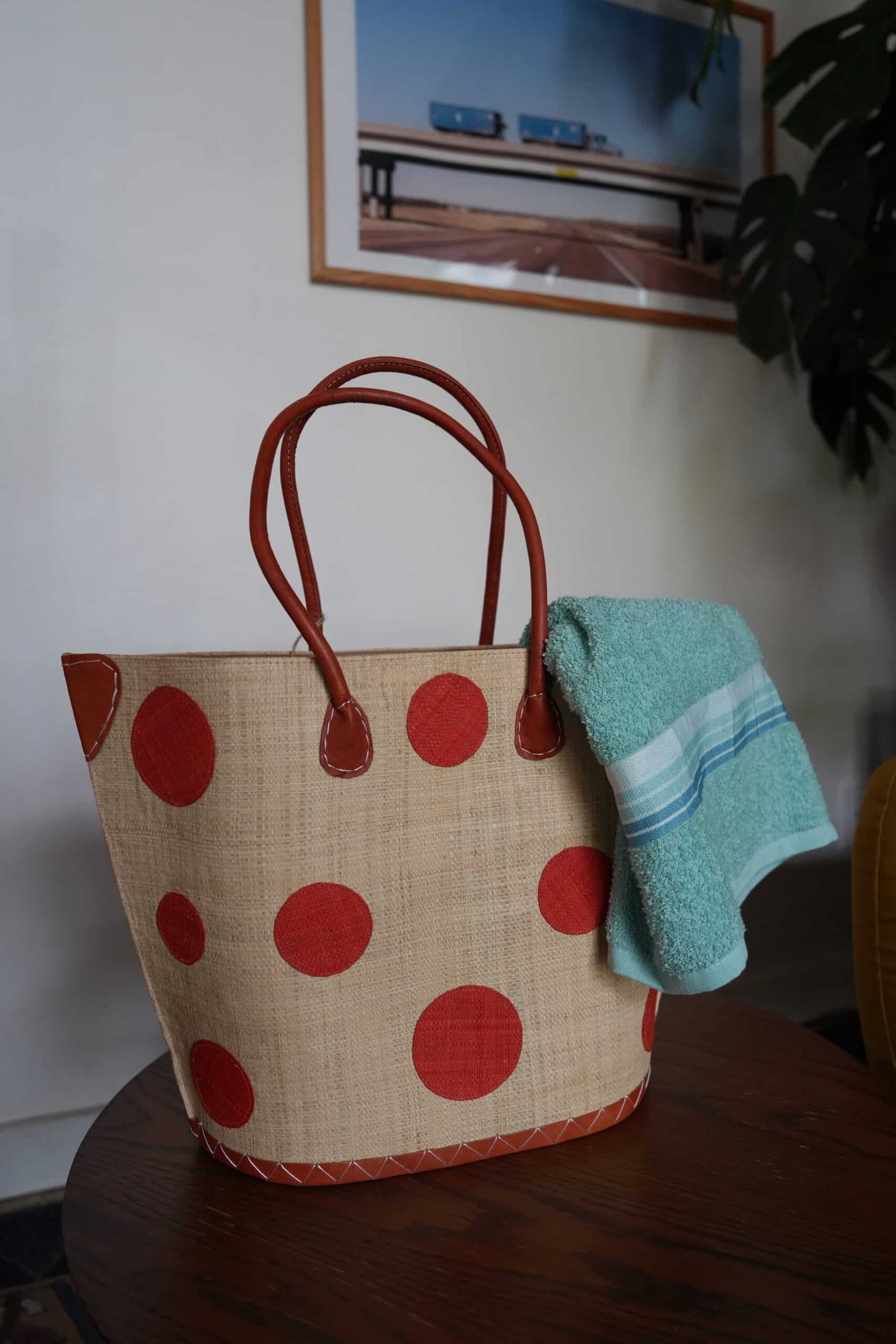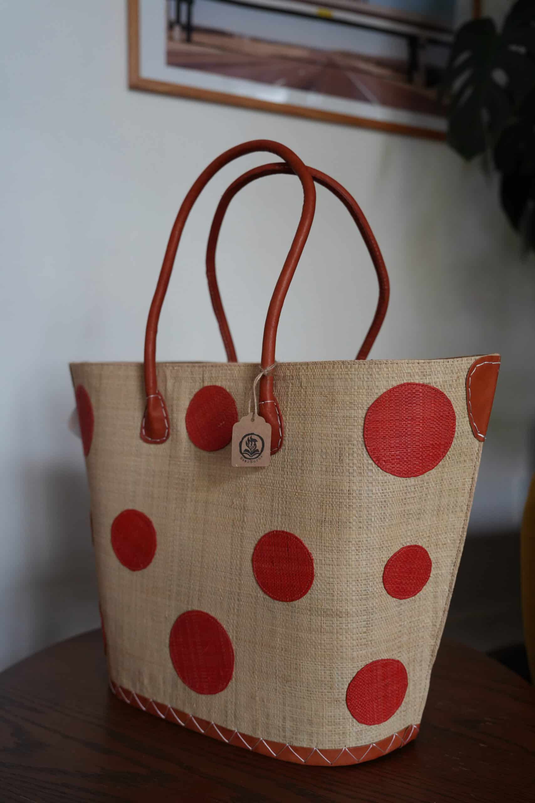 Featuring a textured woven body with bold red polka dots and matching handles, this tote blends playful design with practical use. Whether you’re heading to the cafe, running errands, or carrying your latest book finds, it offers a durable and eye-catching option.