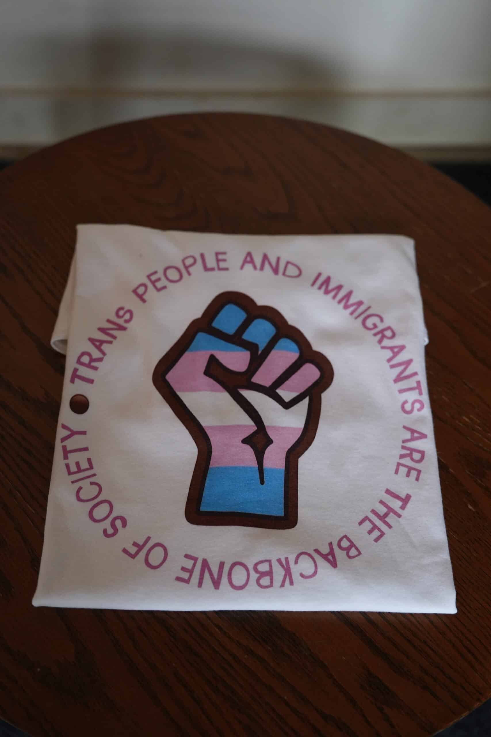 A bold statement T-shirt featuring a trans pride design supporting trans people and immigrants.