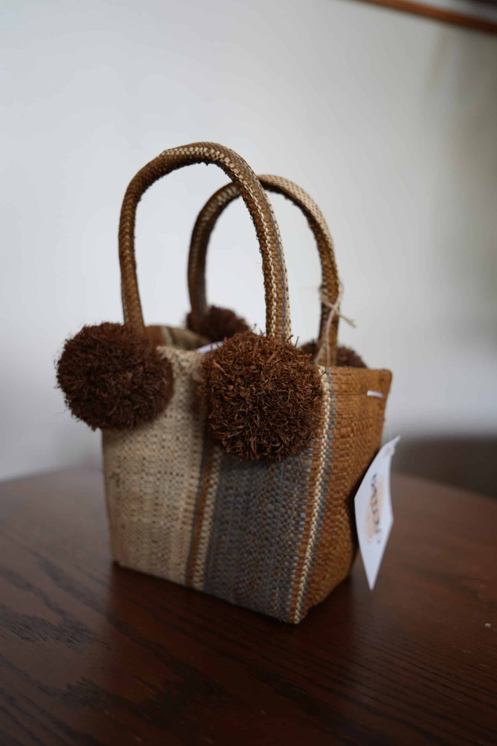 A handcrafted mini tote bag with woven texture and pom pom accents, perfect for everyday essentials.